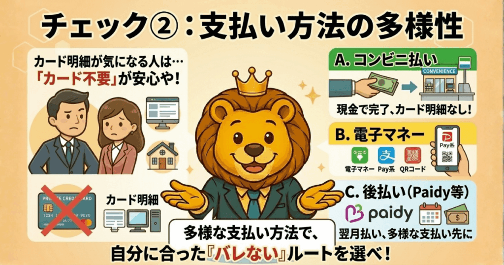 • ✅ コンビニ払い・電子マネーなどカード不要の支払い方法あり