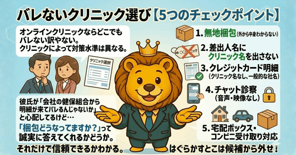 「オンラインクリニックならどこでもバレない」ではない。クリニックによってプライバシー対策の水準は異なる。以下の5点を事前に確認してから申し込むことで、リスクをほぼゼロにできる。
