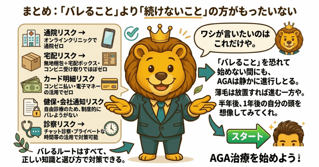 ワシが言いたいのはこれだけや。「バレること」を恐れて始めない間にも、AGAは静かに進行しとる。薄毛は放置すれば進む一方や。半年後、1年後の自分の頭を想像してみてくれ。