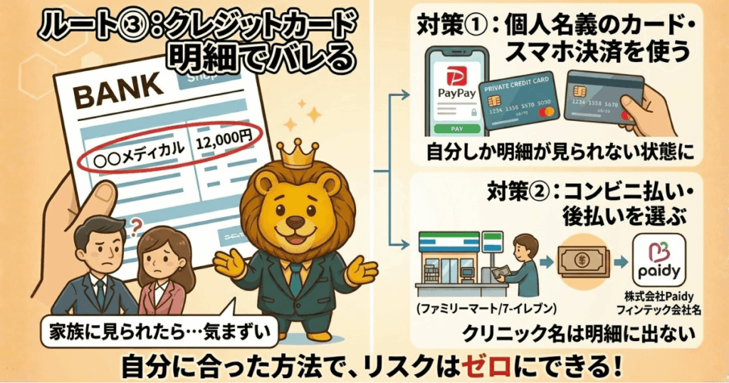 ②コンビニ払い・後払い(Paidy等)を選ぶ。現金でコンビニ払いをすれば、カード明細に何も残らへん。Paidyのような後払いサービスも、支払い先がPaidy(フィンテック会社名)になるため、クリニック名は明細に出てこない。オンラインAGAクリニックのほとんどはコンビニ払いに対応している。