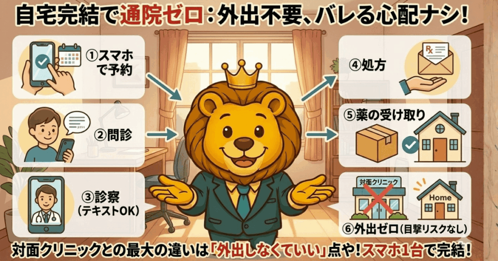 • 通院リスク → オンラインクリニックで通院ゼロ。外出しないから誰にも見られない