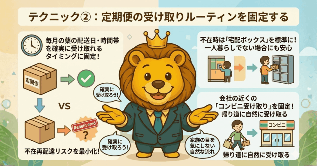 毎月の薬の配送日・時間帯を自分が確実に受け取れるタイミングに固定するのが最も確実や。不在時に再配達になると「荷物来てたけど、なんだろ?」となるリスクが生まれる。