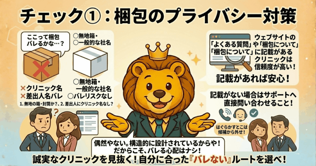 ええか、クリニック選びの前にまず確認してほしいことがある。「梱包どうなってますか?」って問い合わせして、誠実に答えてくれるかどうか。それだけでそのクリニックが信頼できるかどうかがわかる。答えをはぐらかすとこは、それだけで候補から外していい。