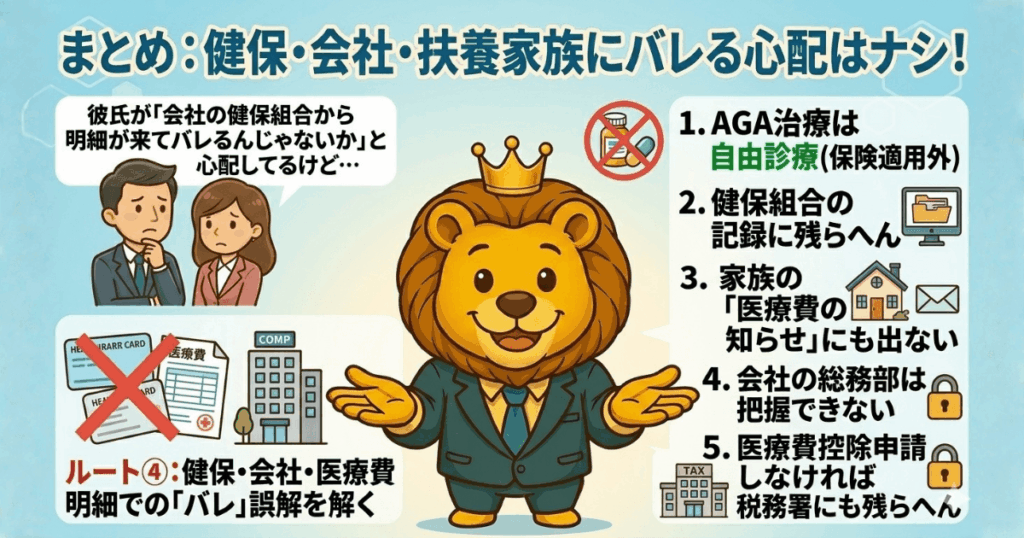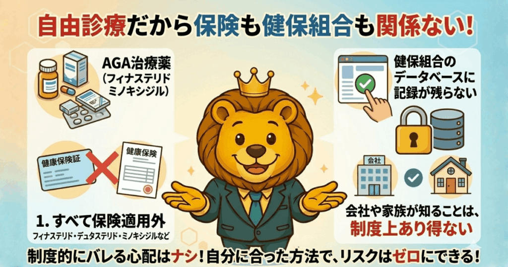 AGA治療薬(フィナステリド・デュタステリド・ミノキシジルなど)はすべて保険適用外の自由診療や。健康保険を使わないということは、健保組合のデータベースに記録が残らないということ。会社や家族が健保組合経由でAGA治療の事実を知ることは、制度上あり得ない。