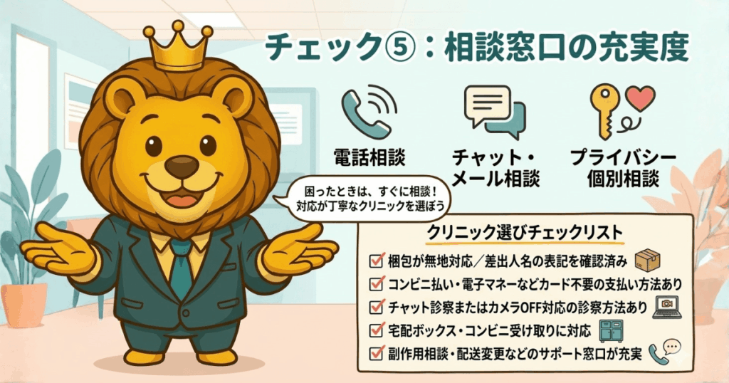 「副作用が出た」「薬の配送タイミングを変更したい」という時に、チャット・メール・電話で相談できる体制があるかを確認する。対応が丁寧なクリニックは、サポートの質も高い傾向にある。プライバシー面での個別相談にも応じてくれるかどうかも、見極めのポイントや。