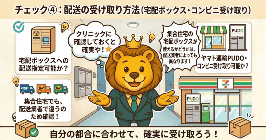 宅配ボックスへの配送指定や、コンビニ受け取り(ヤマト運輸のPUDO・コンビニ受け取り)に対応しているかを確認する。集合住宅の宅配ボックスが使えるかどうかは配送業者によっても異なるため、クリニックに確認しておくと確実や。