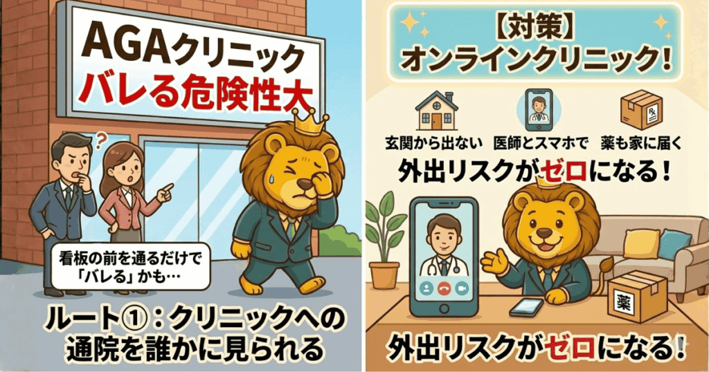 「AGAクリニック」の看板の前を歩いている姿を同僚に見られた——。これが「バレる」シナリオとして最もイメージしやすいやろう。実際、対面クリニックへの通院は最もバレやすいポイントや。クリニックが入っているビルの前に立っているだけで、「何科に行くんだろ?」と思われるリスクがある。