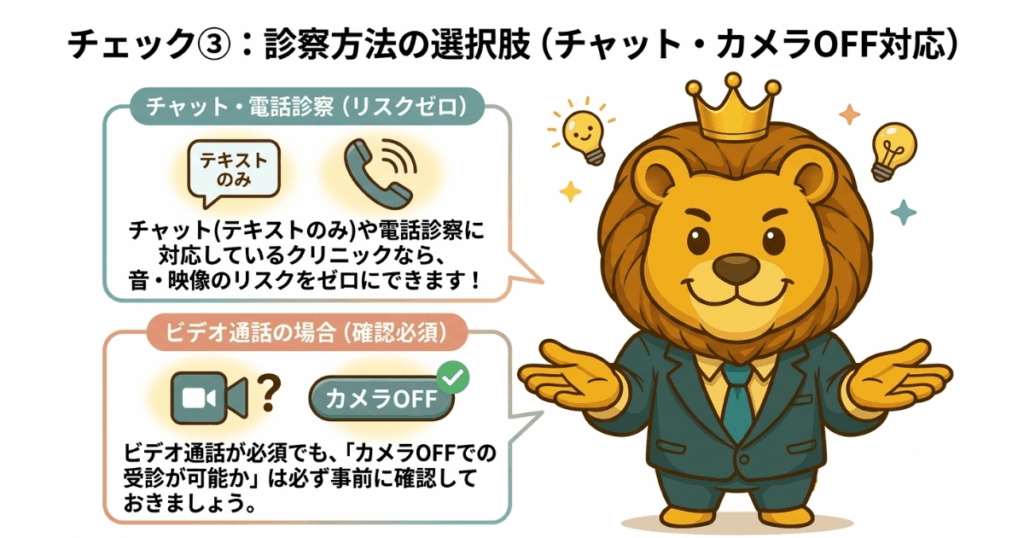 チェック③:診察方法の選択肢(チャット・カメラOFF対応)