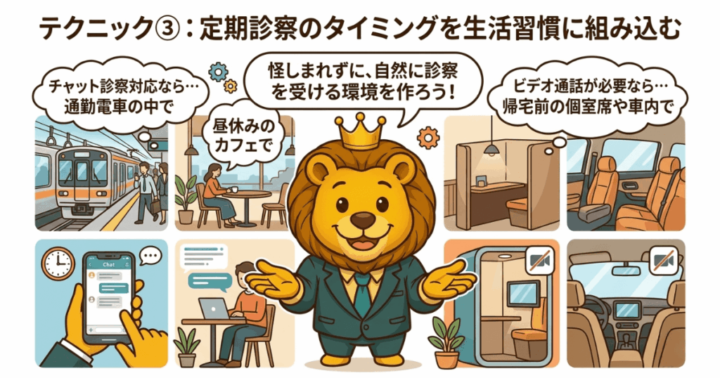 チャット診察対応のクリニックなら、通勤電車の中でも昼休みのカフェでも診察できる。ビデオ通話が必要な場合は、帰宅前に職場近くのカフェの個室席や車内を使うのが現実的や。「診察日」として意識するよりも、生活の中に自然に溶け込ませる感覚で組み込むと継続しやすい。