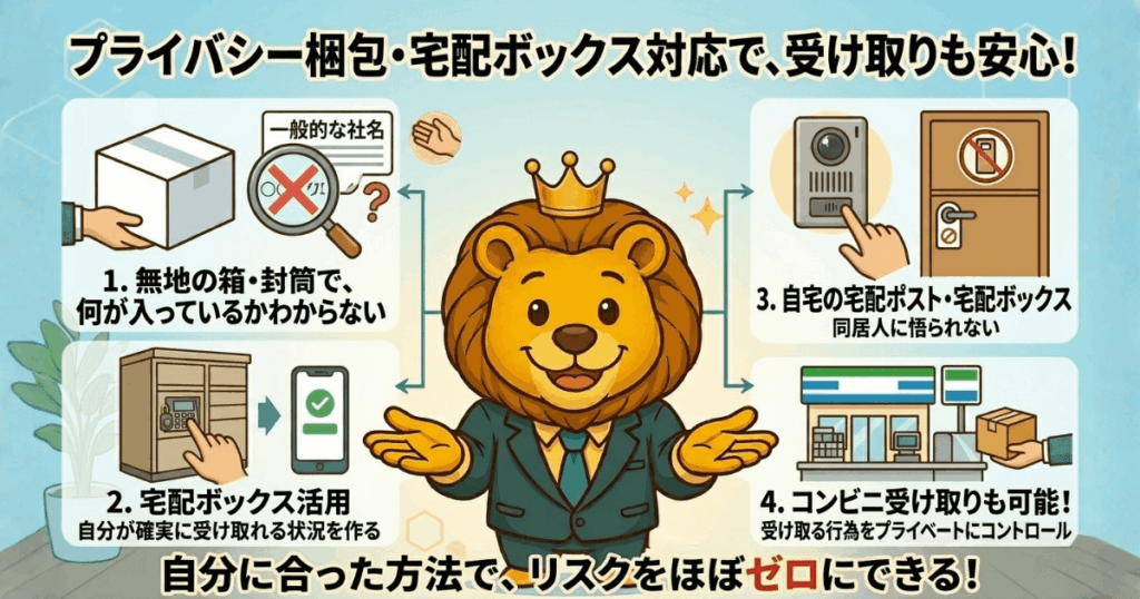 • 宅配リスク → 無地梱包+宅配ボックス・コンビニ受け取りでほぼゼロ