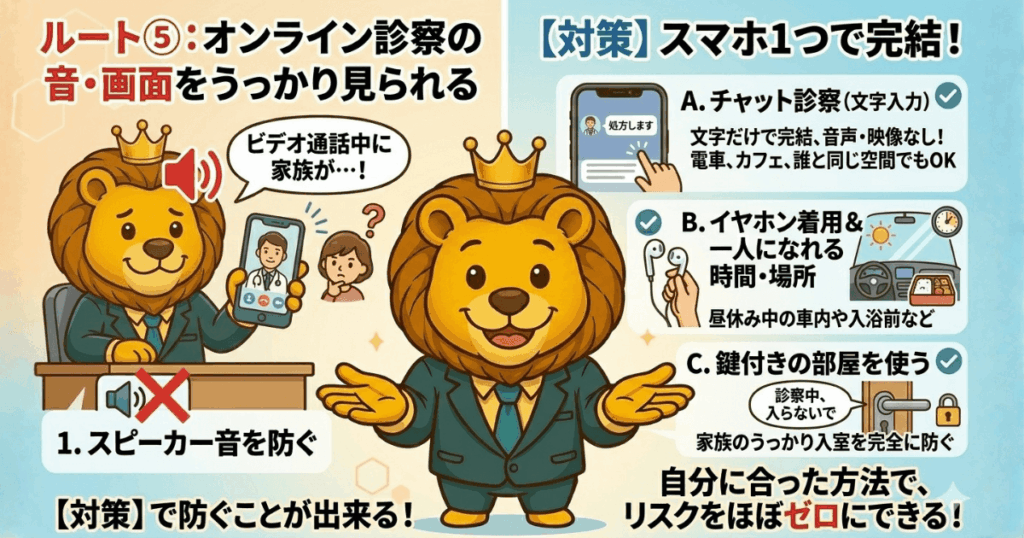 ビデオ通話が必須のクリニックを選ぶ場合は、①イヤホン着用でスピーカー音を防ぐ、②自分が一人になれる時間帯・場所を確保する(入浴前・昼休み中の車内など)、③ドアに鍵をかけられる部屋を使う——この3点を徹底するだけで十分や。