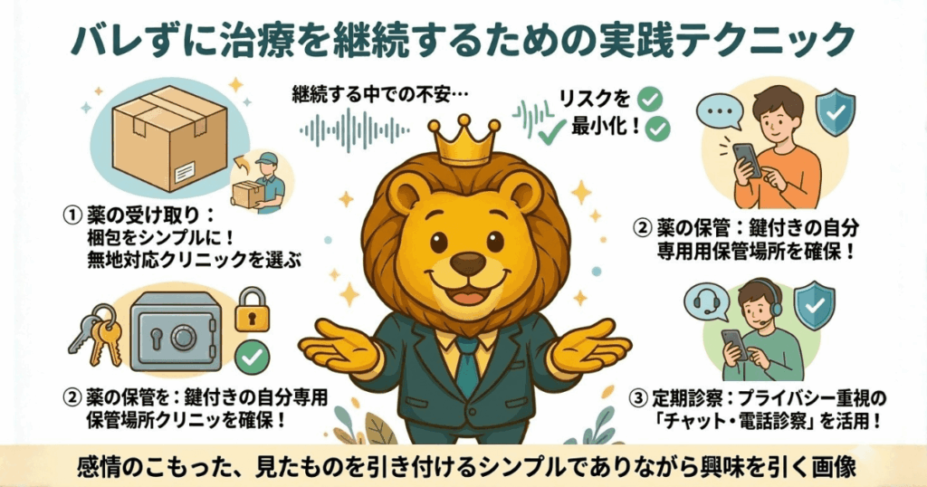 クリニックを選んだ後も、「継続する中でバレないか」という不安が出てくる。薬を飲み続ける限り、毎月の薬の受け取り・保管・定期診察が発生するからや。以下の実践テクニックで、継続中のリスクも最小化できる。