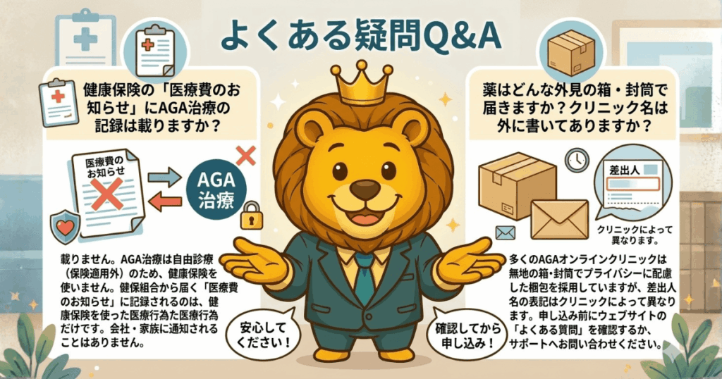 載りません。AGA治療は自由診療(保険適用外)のため、健康保険を使いません。健保組合から届く「医療費のお知らせ」に記録されるのは、健康保険を使った医療行為だけです。AGA治療の事実が会社・家族に通知されることは制度上ありません。
