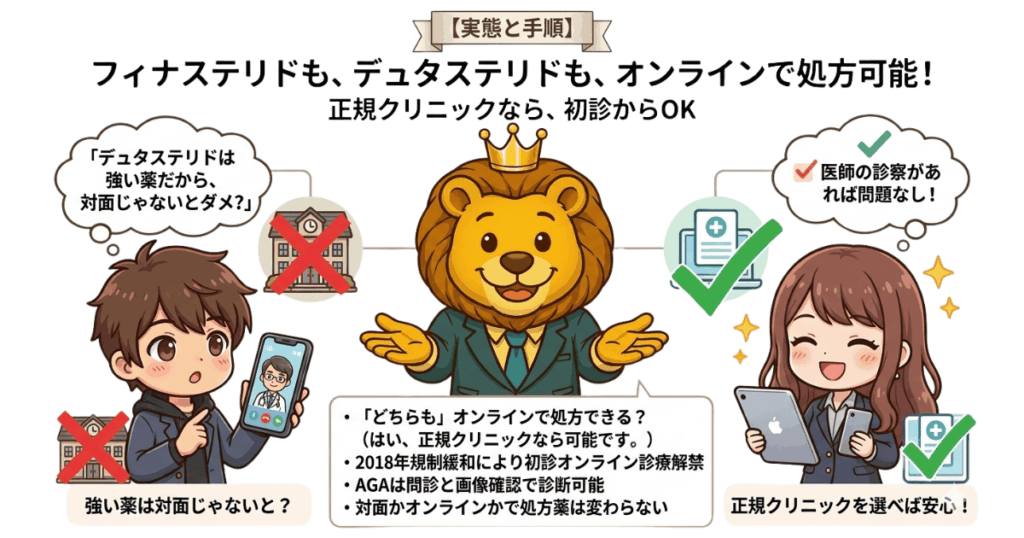 結論から言う。フィナステリドもデュタステリドも、正規のオンラインAGAクリニックで処方可能や。2018年の規制緩和で初診からのオンライン診療が解禁されており、AGAは問診と頭皮の画像確認で診断できるため、オンライン診療に適した疾患や。