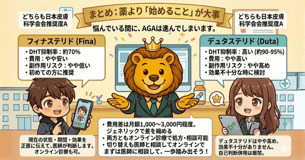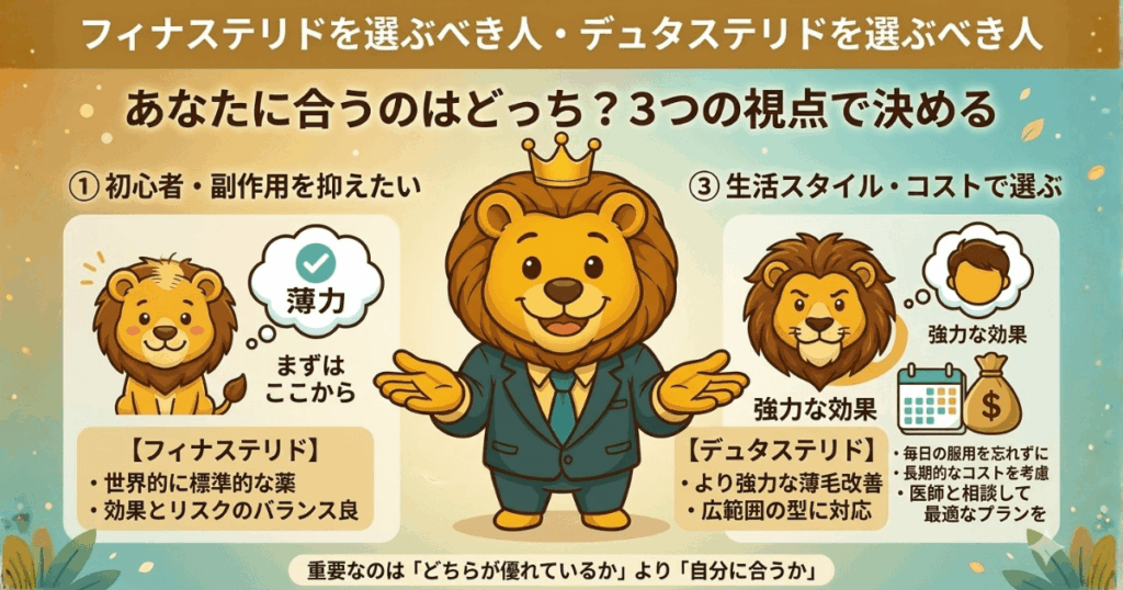 初めてなら、ほとんどのケースでフィナステリドから始めるのが定石や。副作用の出方を見ながら、効果が足りなければデュタステリドへ切り替えるという順序が合理的やねん。最初からデュタステリドを飛ばして選ぶより、段階的に進む方が安全で確実や。