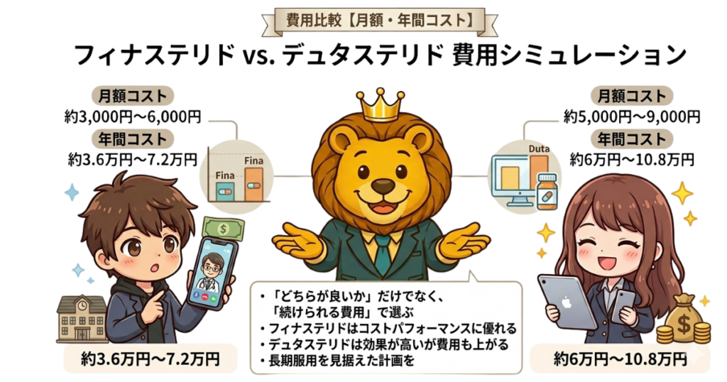 デュタステリドはフィナステリドより月額で1,000〜3,000円程度高くなるのが一般的や。ただしジェネリック品の普及が進んでおり、差は縮まりつつある。