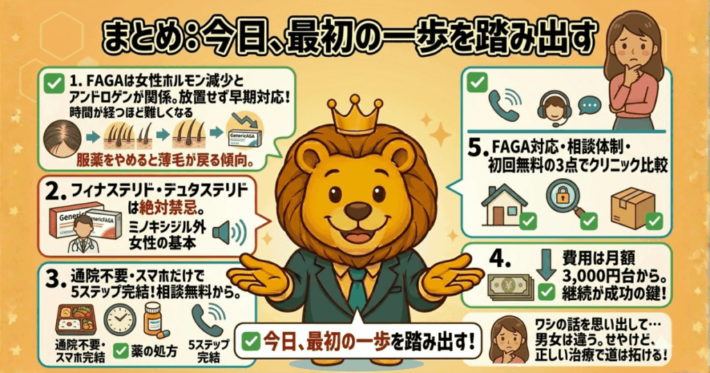 女性のFAGAに対応しているかを確認。後述の4つのチェックポイントを基準に比較する。初回カウンセリング無料のクリニックから始めると相談のハードルが低い。