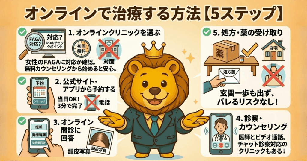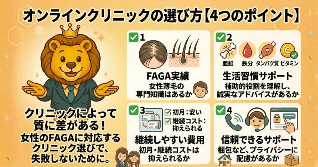 「オンラインクリニックならどこでも同じ」ではない。女性のFAGAに対応する質は、クリニックによって大きく差がある。以下の4点を事前に確認してほしい。