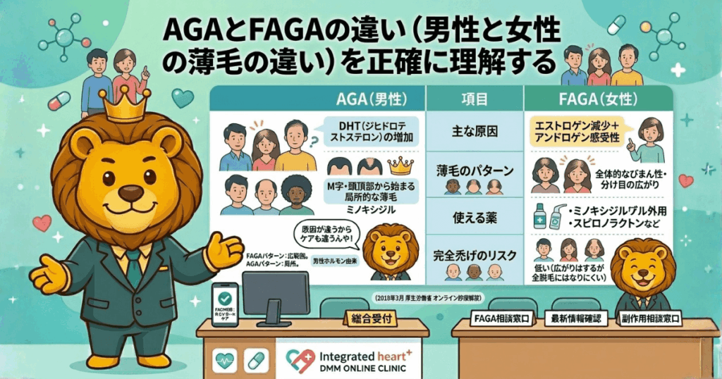 AGAとFAGAは、ホルモンが関与するという点では共通しているが、薄毛のパターン・使える薬・進行度が大きく異なる。この違いを正確に理解することが、正しい治療の第一歩や。