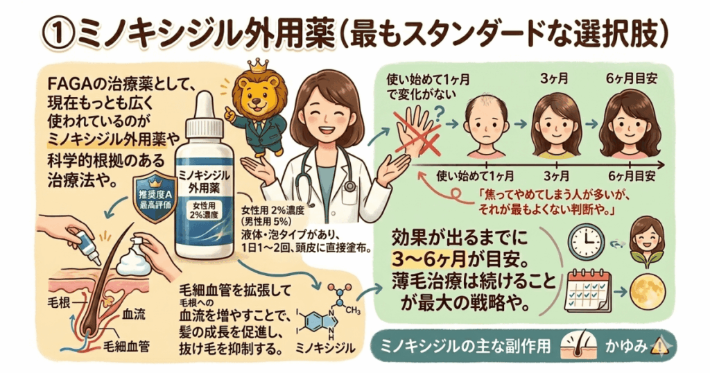 FAGAの治療薬として、現在もっとも広く使われているのがミノキシジル外用薬や。日本皮膚科学会のFAGAガイドラインでも推奨度A(最高評価)を獲得している、科学的根拠のある治療法や。
