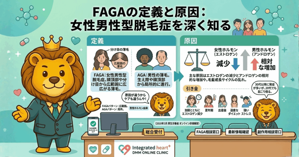 - FAGAは女性ホルモンの減少とアンドロゲンが関係する疾患。放置するほど治療が難しくなる
