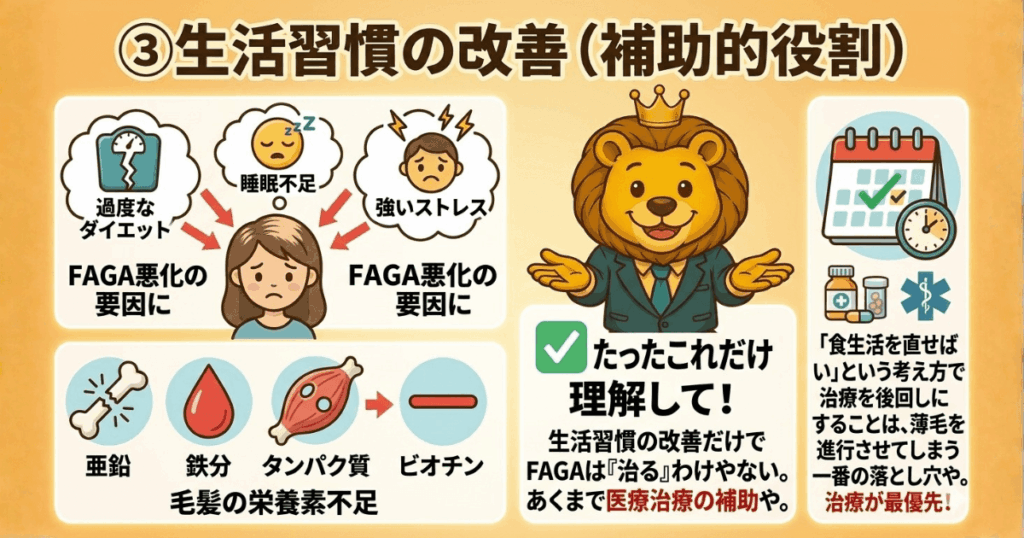 ただし、生活習慣の改善だけでFAGAが「治る」わけではないことは理解してほしい。あくまでも医療治療の補助的な役割や。「食生活を直せばいい」という考え方で治療を後回しにすることが、薄毛を進行させてしまう一番の落とし穴や。