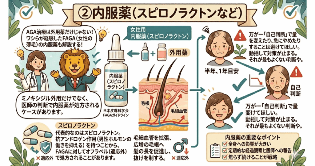 ミノキシジル外用だけでなく、医師の判断で内服薬が処方されるケースがある。代表的なのはスピロノラクトンや。もともと利尿薬として開発されたが、抗アンドロゲン作用(男性ホルモンの働きを抑える)を持つことから、FAGAに対してオフラベル(適応外)で処方されることがある。
