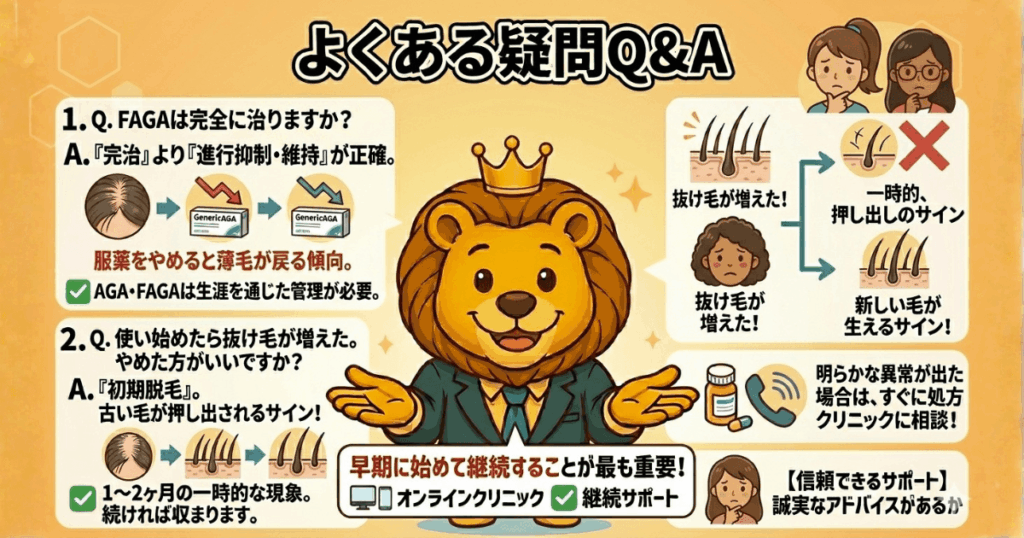「完治」より「進行を止め、現状を維持・改善する」が正確な表現です。薬を続けている間は効果が持続しますが、服薬をやめると薄毛が戻る傾向があります。AGA・FAGAは生涯を通じた管理が必要な疾患であり、早期に始めて継続することが最も重要です。