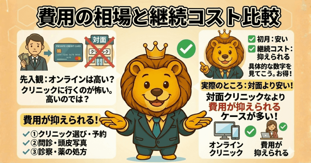 それや。継続できるかどうかが結果に直結する。高くて途中でやめてしまうより、月3,000円台で1年続ける方が断然ええ。まず「無理なく続けられる費用か」を最優先に考えてクリニックを選んでくれ。