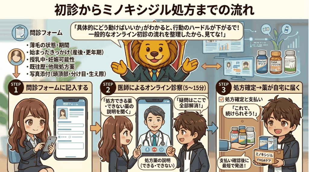 「具体的にどう動けばいいか」がわかると、行動のハードルが下がる。一般的なオンライン初診の流れを整理する。