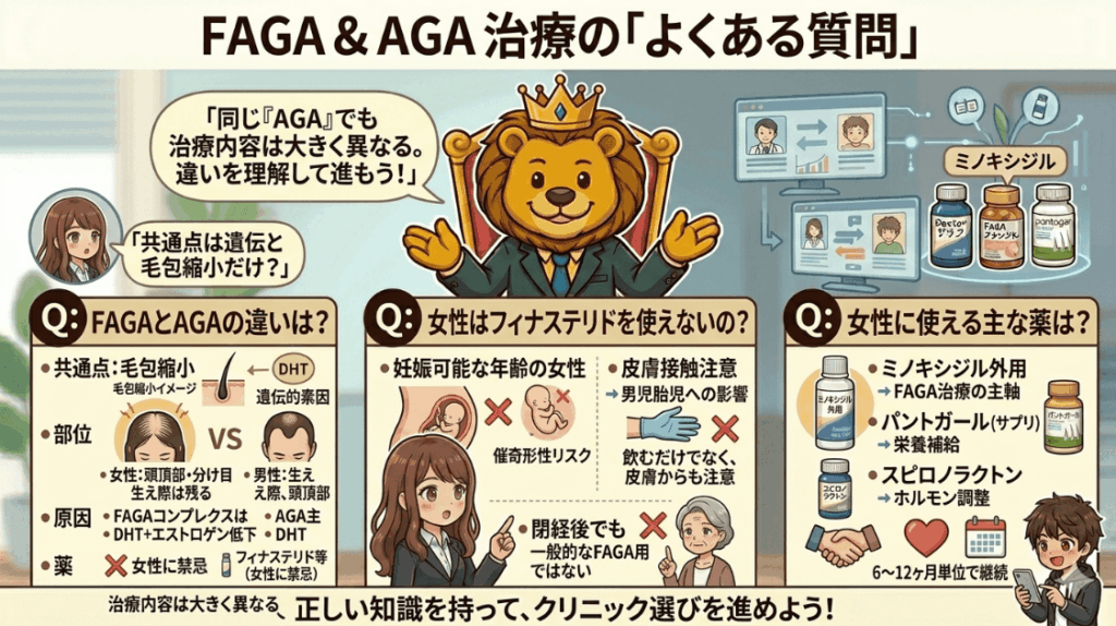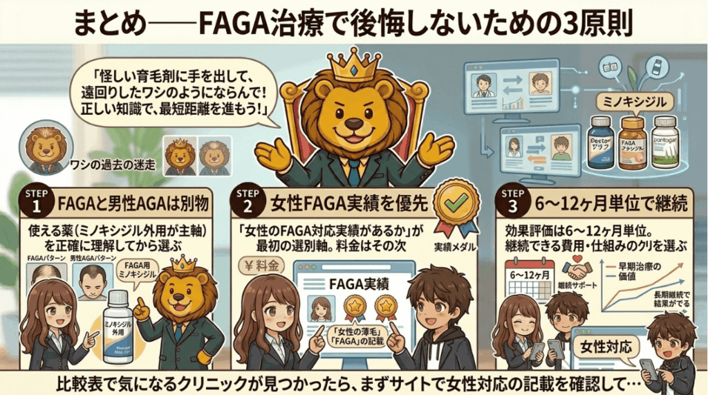 • 原則①:FAGAと男性AGAは別物。使える薬(ミノキシジル外用が主軸)を正確に理解してから選ぶ