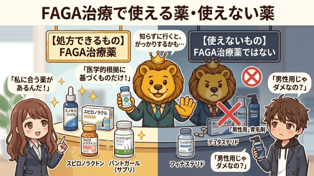 クリニックを選ぶ前に、FAGA治療の「処方できるもの・できないもの」を整理しておこう。知らずにクリニックに行くと「思ってた薬が出なかった」という展開になる。