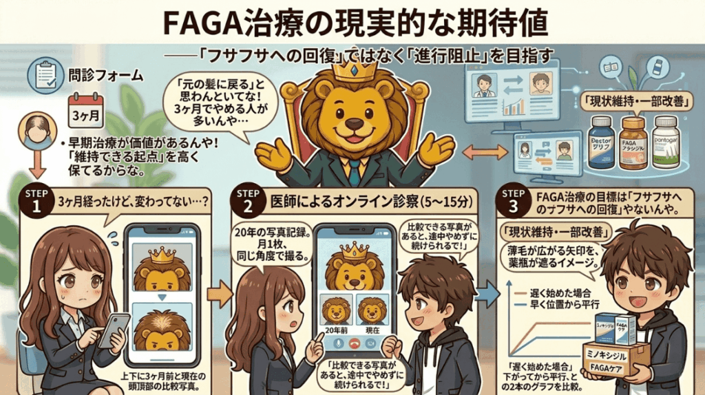FAGA治療の目標は「フサフサへの回復」やない。「進行を止めて、現状を維持または一部改善する」ことや。男性AGAと同じや。早く始めるほど「維持できる起点」が高い位置からになる。それが早期治療の価値や。