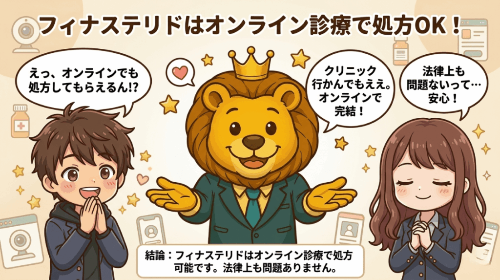 「クリニックに行かなアカンのとちゃうか?」——最初にそう思う人が多い。結論から言うと、フィナステリドはオンライン診療で処方してもらえる。法律上も問題ない。
