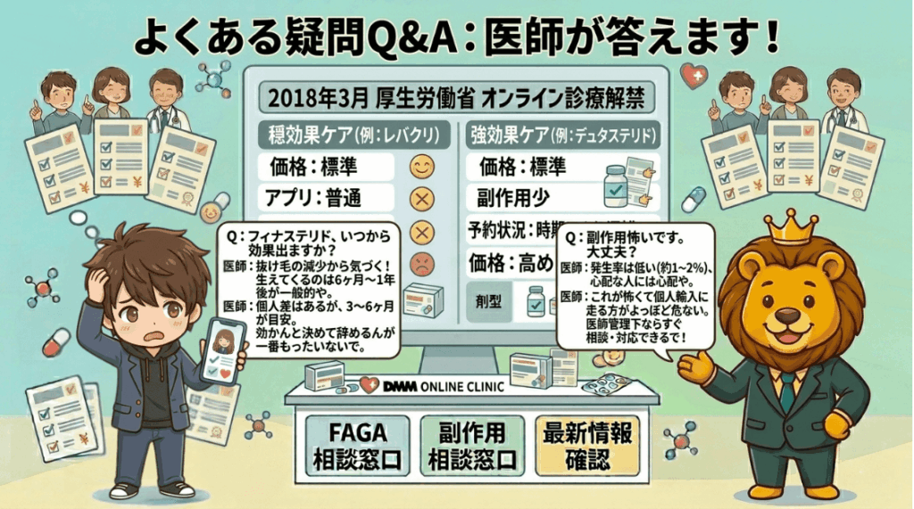 フィナステリドを飲み始めて、初期脱毛(一時的に抜け毛が増える現象)が起きることがある。あるいは極めてまれだが性機能への影響が気になる人もいる。そういう時に「チャットや電話で医師に相談できるか」は重要や。薬を売ったら終わり、みたいなクリニックには近づくなよ。