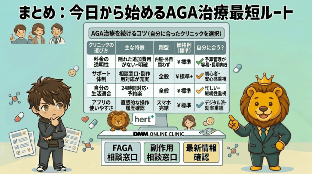 毎月の薬の受け取り方法、配送サイクル、アプリの使いやすさ——地味やけど、これが「続けられるかどうか」を左右する。AGA治療は最低でも6ヶ月〜1年以上の継続が必要や。生活の中に組み込みやすいクリニックを選ぶことが、長期的な成功につながる。