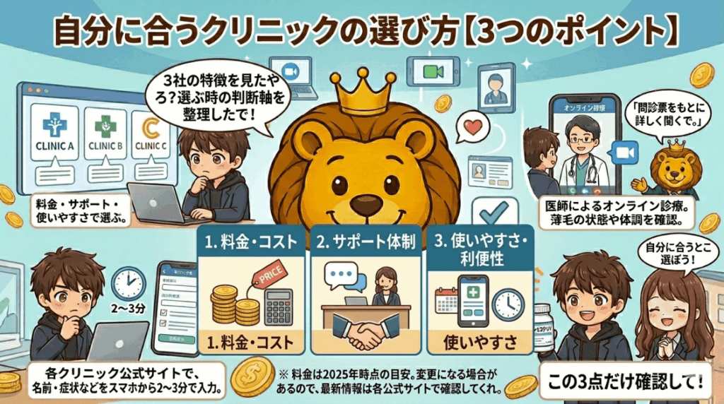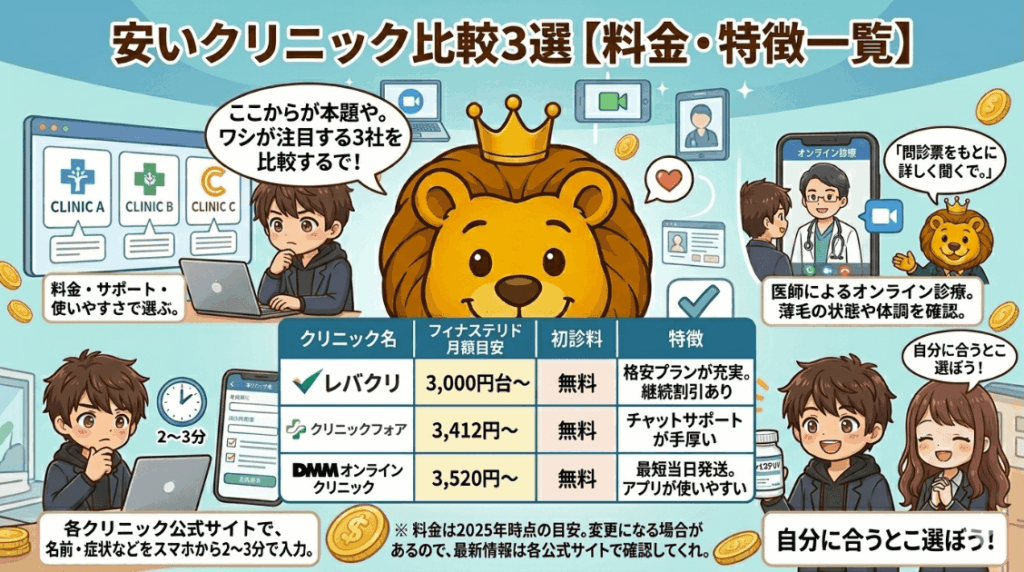 ここからが本題や。フィナステリドをオンラインで処方してくれるクリニックは複数あるが、ワシが特に注目している3社を比較する。