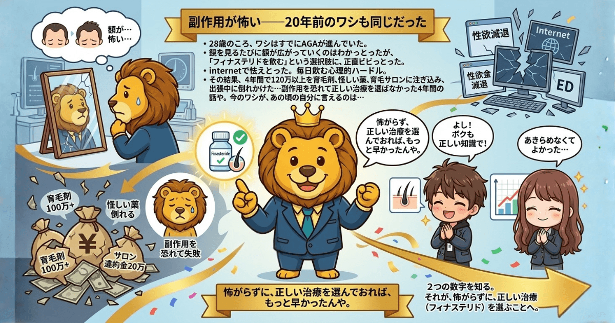 副作用への恐怖で4年間先延ばしにした。その4年間が、ワシの人生で一番後悔しとる選択や。副作用は出なかったとは言わへん。でも、あの4年間の方が、ずっと高くついた。AGAは時間が敵や。