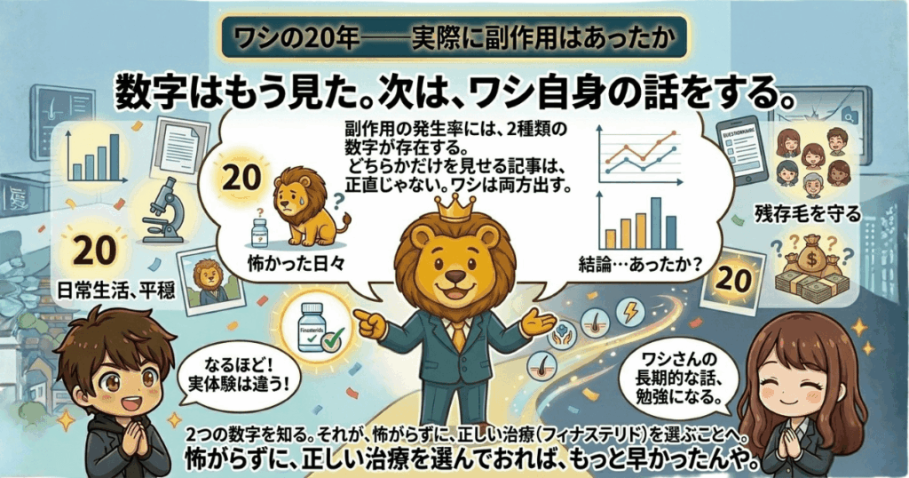 AGA治療薬の副作用リスクと、何もせずにAGAを進行させ続けるリスク——両方を天秤にかけたとき、ワシの20年の答えはシンプルや。始めてよかった。それだけや。