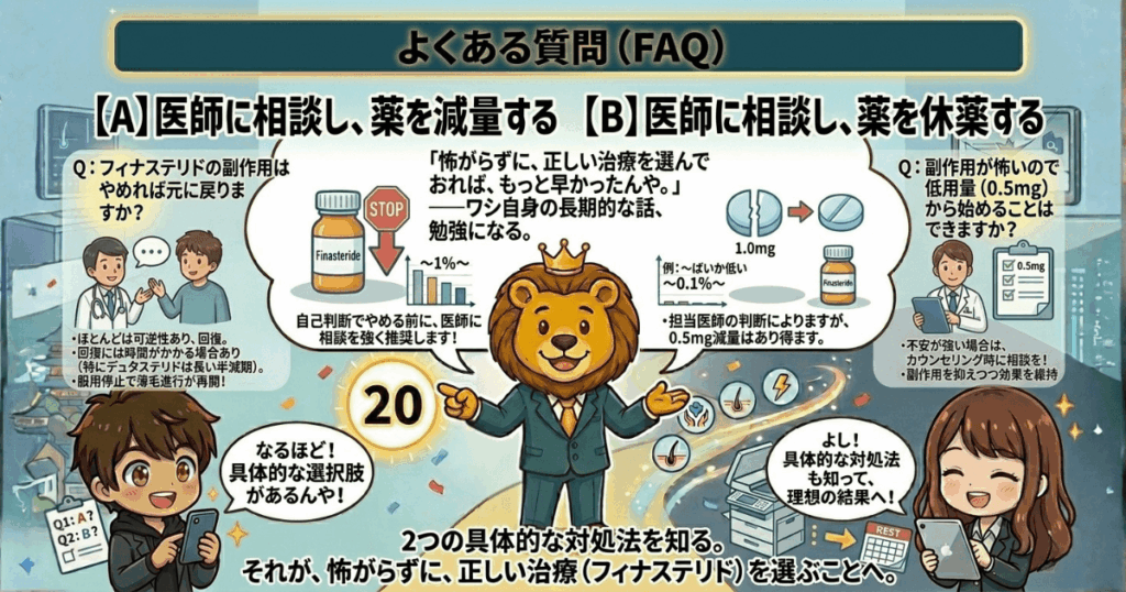 ほとんどの副作用は可逆性があり、服用をやめれば回復することが多いとされています。ただし、回復には時間がかかる場合があります(特にデュタステリドは半減期が長いため、体から抜けるまで時間を要します)。また、服用をやめると薄毛の進行が再開する点も覚えておいてください。副作用が出た場合は、自己判断でやめる前に担当医師に相談することを強くすすめます。