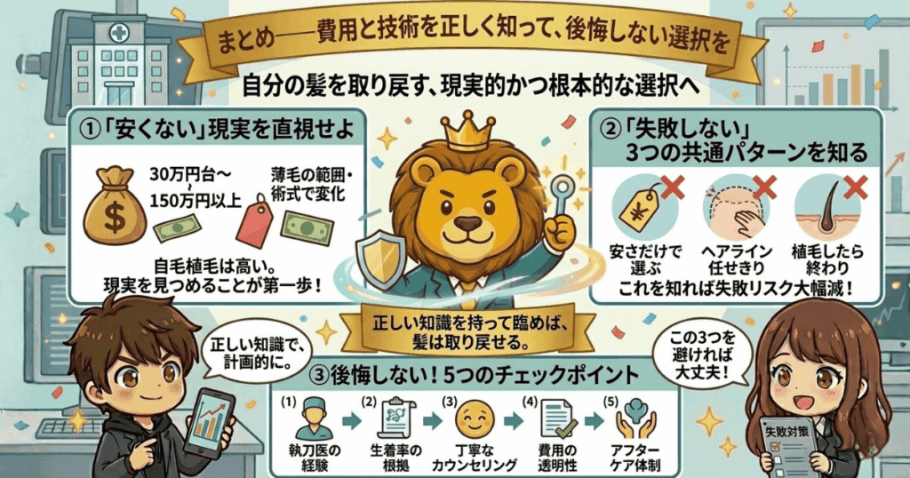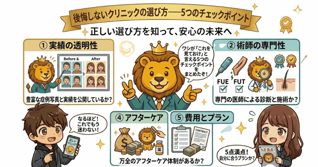 5つのチェックポイント(執刀医の経験・生着率の根拠・カウンセリングの丁寧さ・費用の透明性・アフターケア体制)を軸に、複数のクリニックで無料カウンセリングを受けて比較することを強くすすめる。自毛植毛は高額な医療行為や。慌てて決める必要はない。納得したうえで選んでくれ。