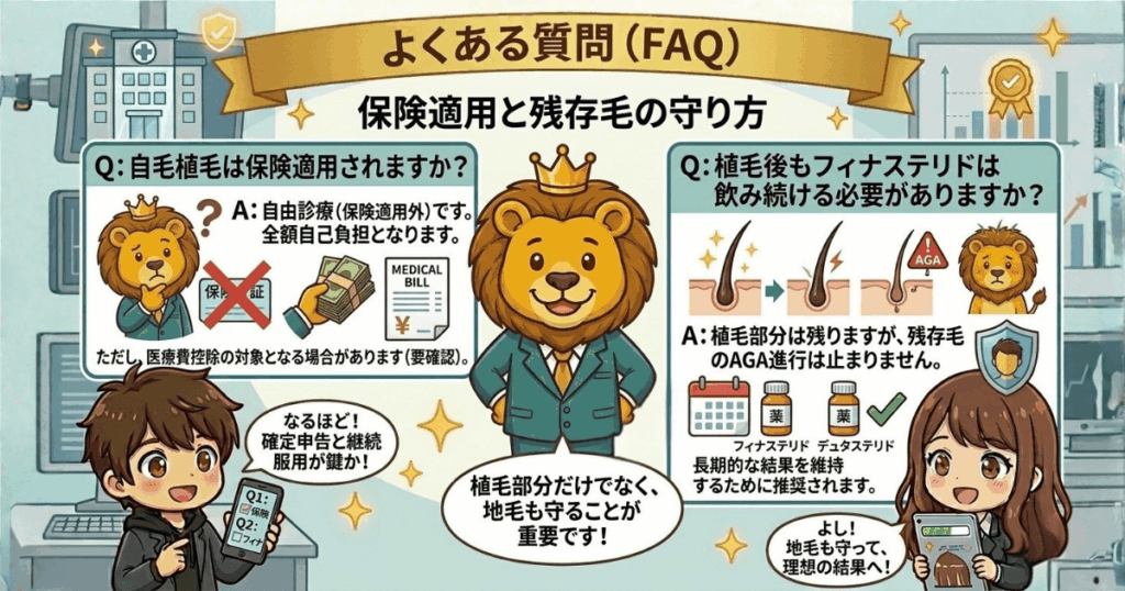 移植した毛はAGAの影響を受けにくいため、植毛部分の毛は基本的に残ります。しかし、植毛していない部分の地毛はAGAで引き続き進行します。植毛後も残存毛を守るためにフィナステリド(またはデュタステリド)の継続服用を推奨するクリニックが多く、長期的な結果を維持するうえで重要な選択肢となります。担当医師と相談して決めてください。
