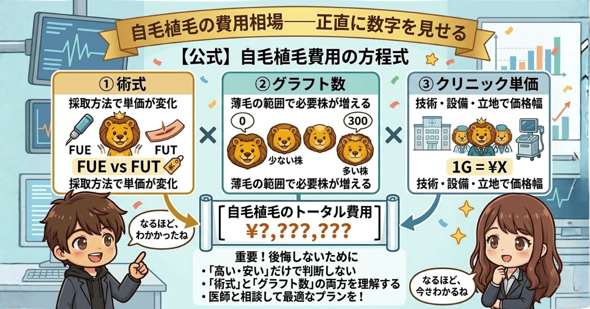 まず前提として、自毛植毛の費用は「術式」と「グラフト数」の掛け算で決まる。どちらの要素も理解せずに「高い・安い」だけで判断すると、必ず後悔する。
