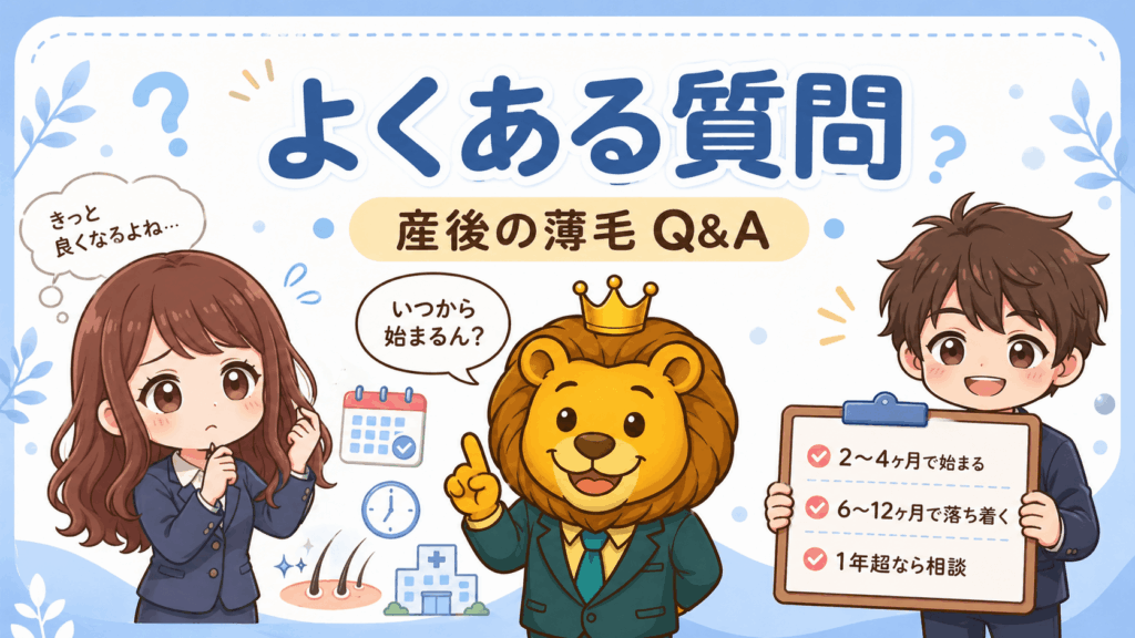 産後12ヶ月経っても改善しない場合は、産後脱毛以外の原因が考えられる。代表的なものに女性型AGA(FAGA)と甲状腺疾患がある。どちらも自然には改善しないため、皮膚科・薄毛専門クリニックでの診察を受けることを勧める。オンライン診療で最初の相談をするだけでも、状況を整理する助けになる。