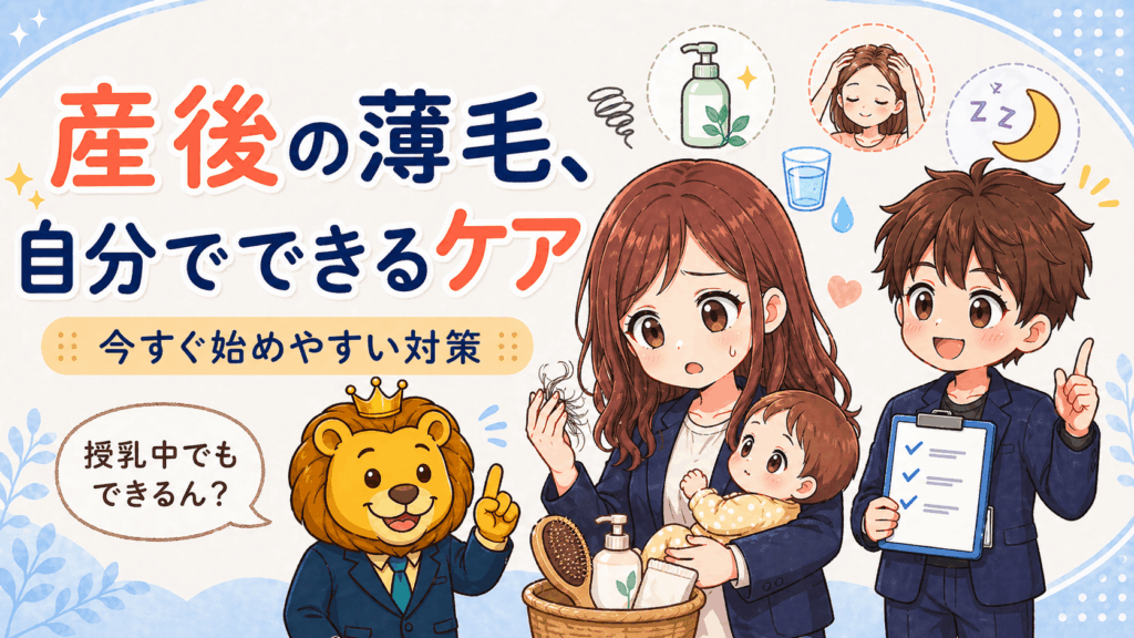 産後は育児・授乳で体の栄養が消耗しやすい。毛髪を作る材料となるタンパク質・鉄・亜鉛・ビオチン(ビタミンB7)が不足すると、抜け毛が加速することがある。食事で取りにくければ、授乳中でも使えるサプリメント(産後向けのものが各種ある)を医師に相談のうえ取り入れてみることも選択肢の一つや。