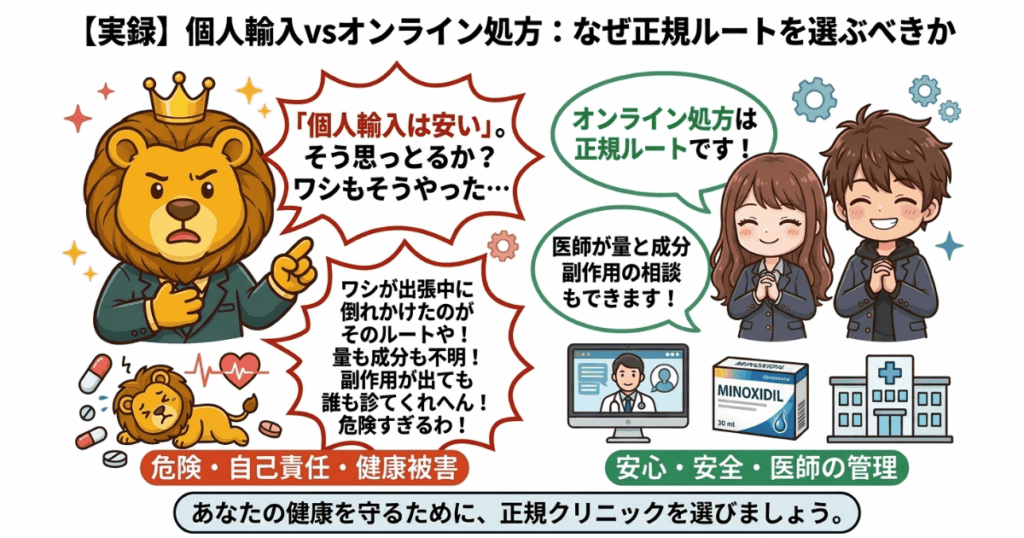 個人輸入でミノキシジルを入手できることは事実や。しかし、そのリスクを正直に言う。