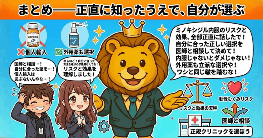 体毛増加が絶対NGなら、外用ミノキシジルで十分や。それも正しい選択や。「内服じゃないとダメ」ということはない。自分の優先順位と許容できるリスクに合わせて、医師と一緒に判断してくれ。