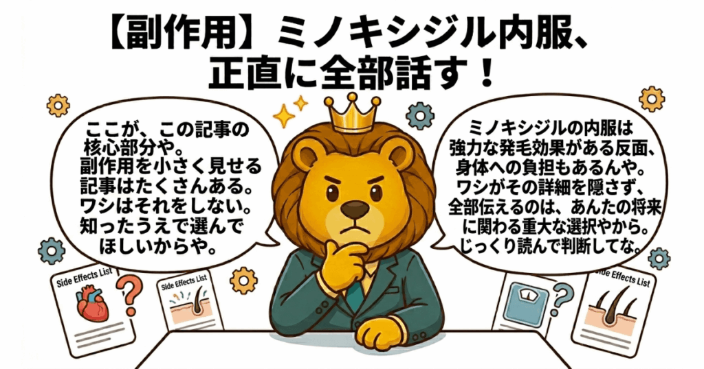 ワシはAGAライオン。大手会社の管理職を20年以上やりながら、AGAと正面から向き合ってきた48歳や。育毛剤に100万以上を捨て、個人輸入で出張中に倒れかけた。そういう失敗を全部経験した男が、ミノキシジル内服の副作用を正直に全部話す。処方の手順も教える。やめておいた方がいい人のことも、ちゃんと言う。