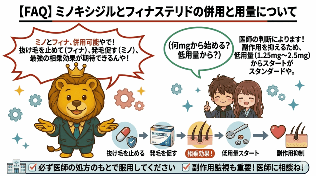 併用可能です。フィナステリドが「抜け毛を止める」作用、ミノキシジルが「発毛を促す」作用を持つため、両者は作用機序が異なり相乗効果が期待できます。多くのAGAクリニックでは、フィナステリド+ミノキシジル内服のセット処方をスタンダードなプランとして提供しています。ただし、使用する薬が増えるほど副作用の監視も重要になります。必ず医師の処方のもとで服用してください。